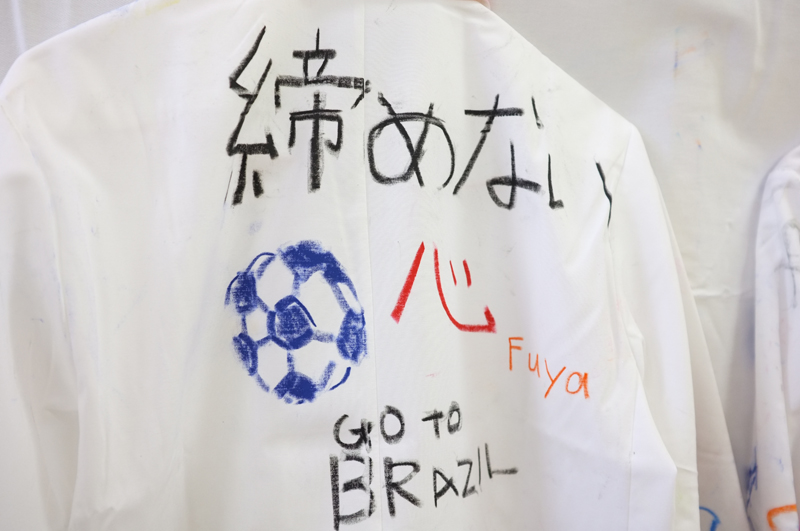 白衣の背中や正面だけでなく、袖のところもキャンバス。男の子は笑顔というよりも、真顔で熱中している、といった印象(笑)。