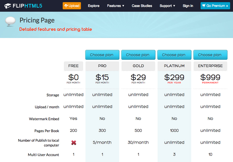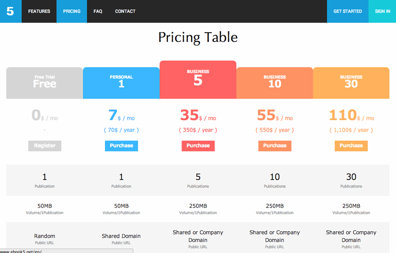 料金プランは、1冊/50MBの個人プランで月額7USドル(約718円)、ビジネスプランは5冊/250MBで35USドル(約3,585円)からで、企業の独自ドメインでの公開も可能です。