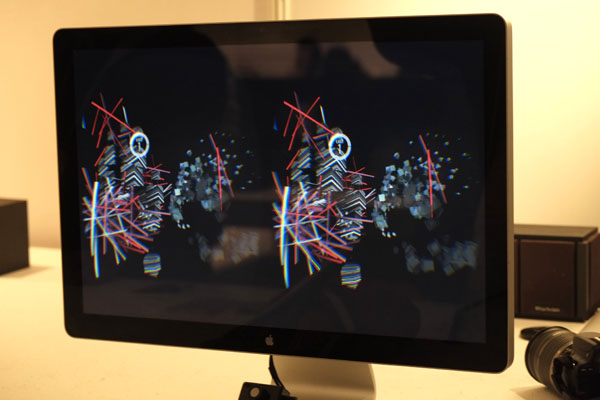 デバイスは、VR用ヘッドマウントディスプレイ「Oculus Rift(オキュラス リフト)」の前面に、手のジェスチャーで入力できる「Leap Motion(リープモーション)」をくっつけたもの。これによって、VR映像を見ながら手を使って音や映像をリアルタイムに創り出すことができるというわけです。
