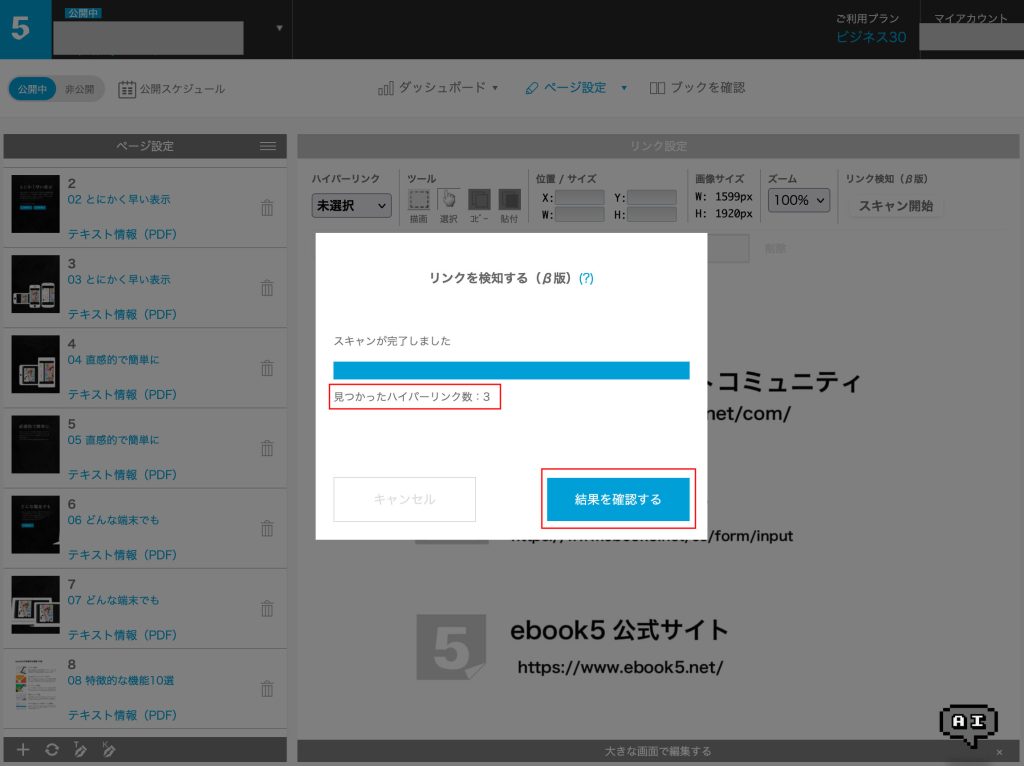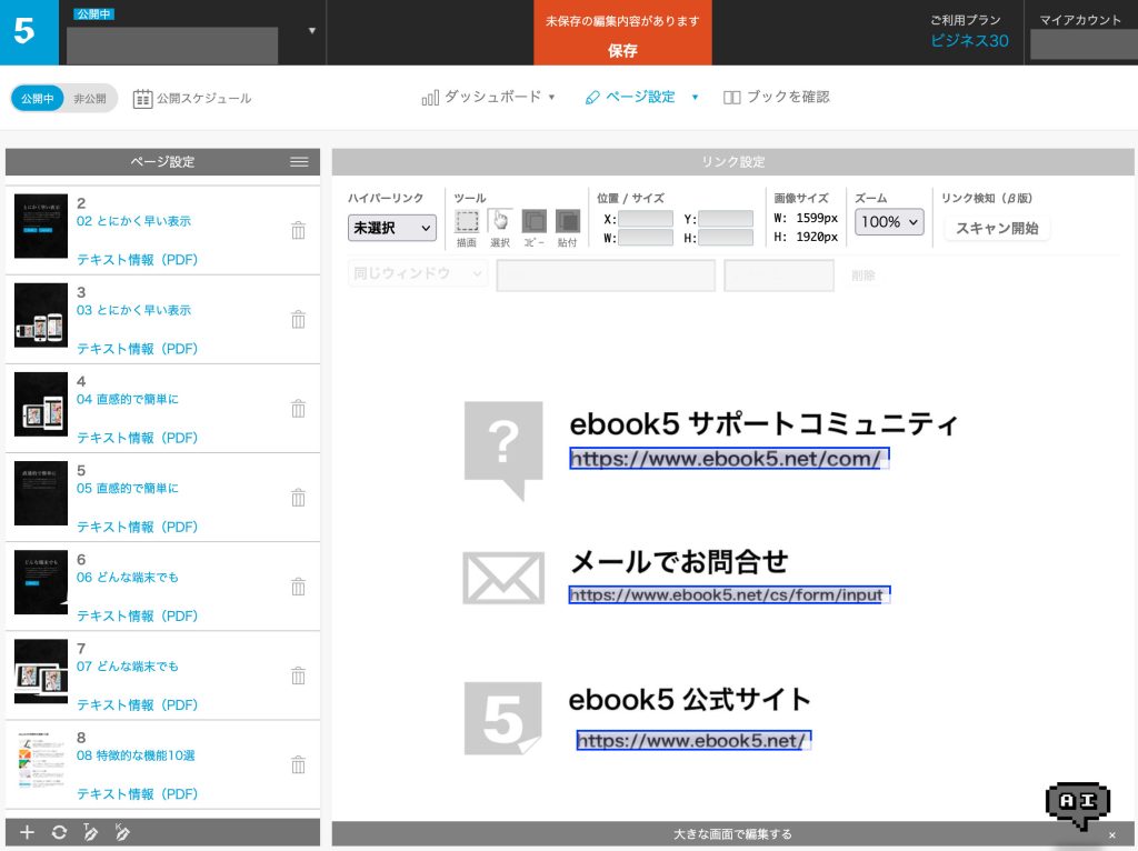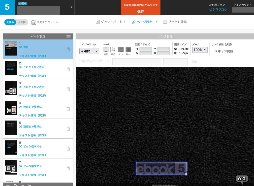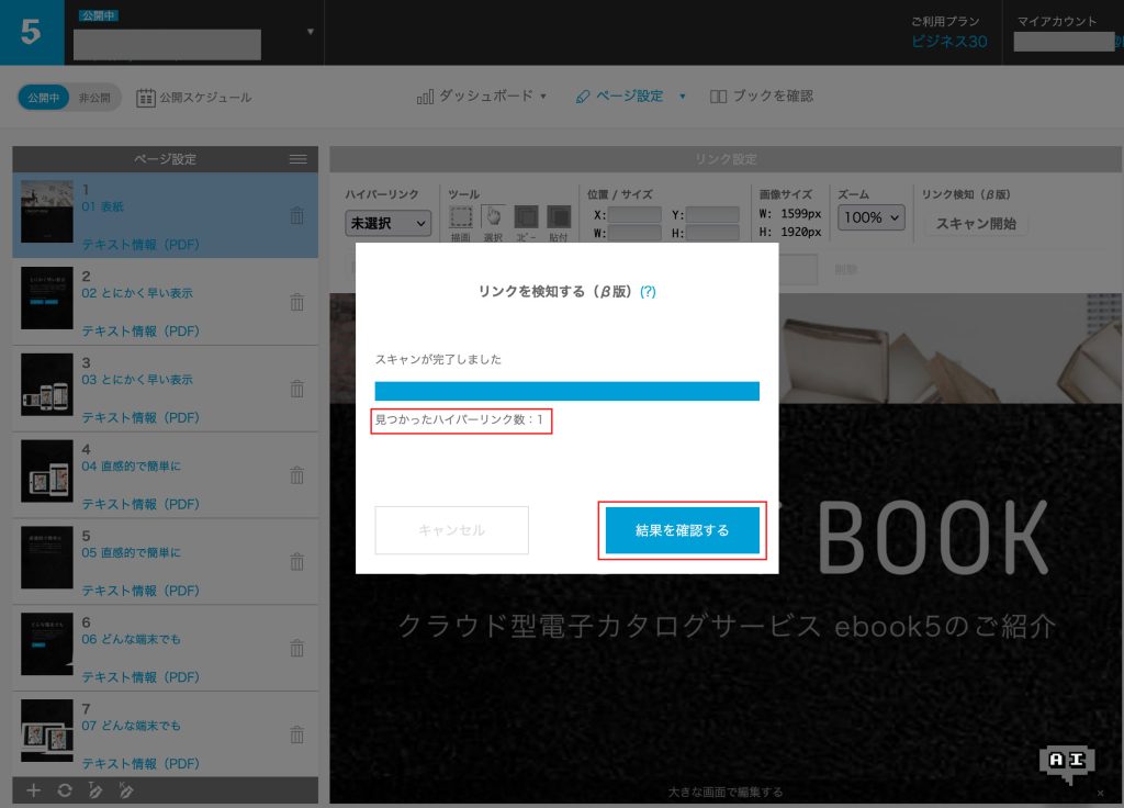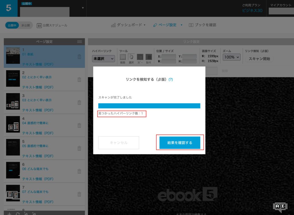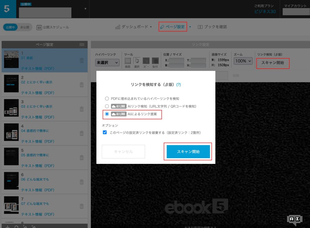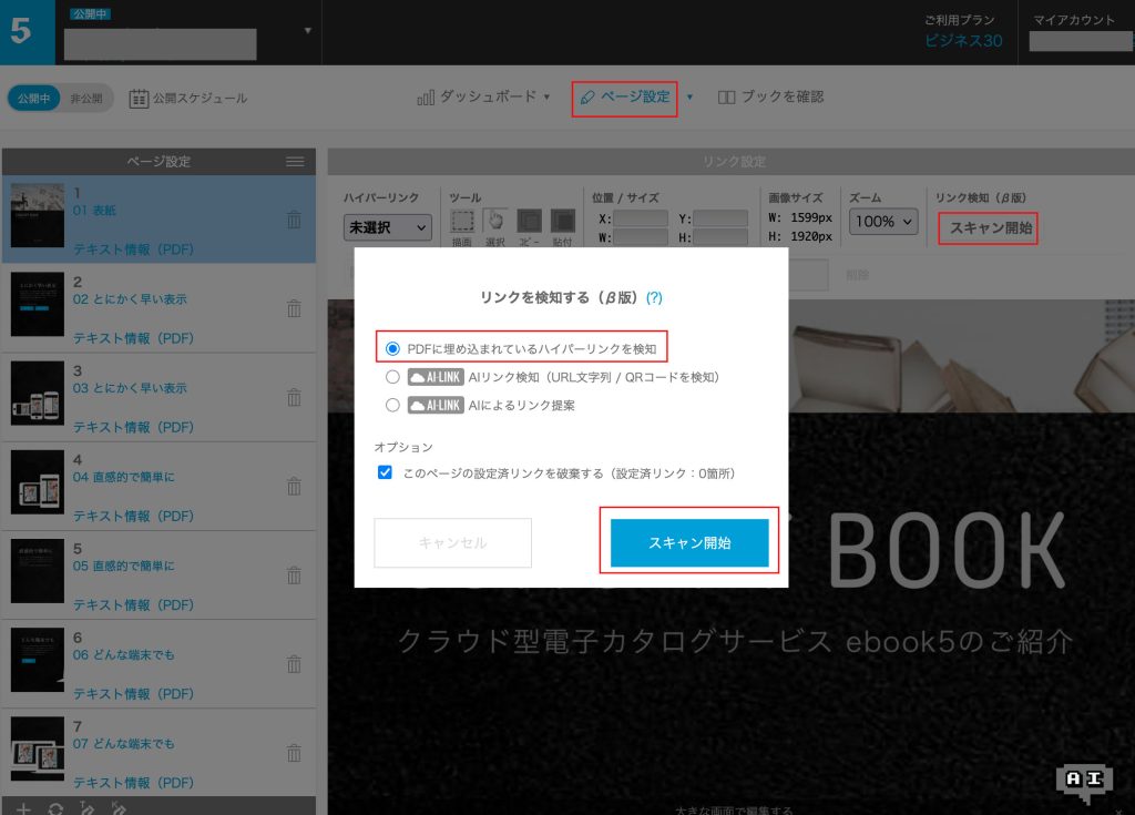 ハイパーリンクのあるAdobe AcrobatやWebページから保存されたPDFをアップロードしてブックを作成した後に、管理画面からページ単位で設定済みリンクを検知しebook5へ取り込む機能になります。