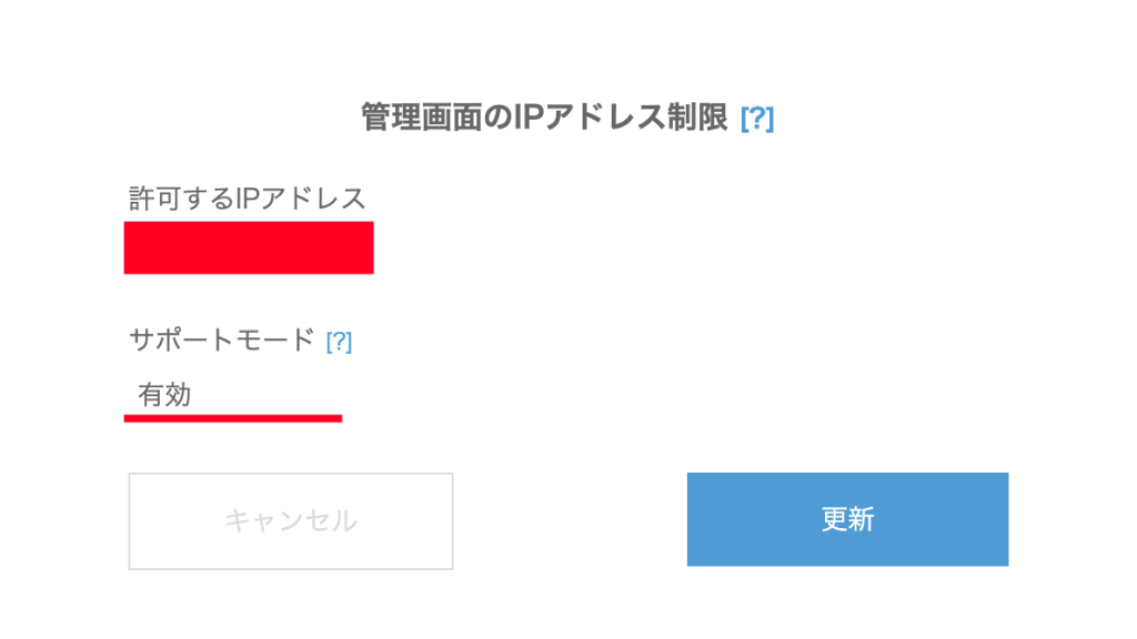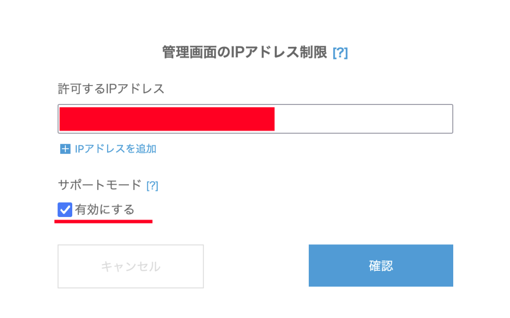 管理画面を共有してのサポートをご希望の場合、サポートモードを「有効にする」に設定してください。