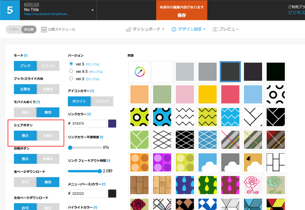 SNSシェア機能について Created: 2017年8月28日 ebook5ビューア内に「xへのポスト」と「Facebookでシェア」機能を表示させることができます。 ビューアで表示する スマートフォン(Portraitモード)では左下のメニューボタンからSNSシェアが可能です。(ビューアver.5) パソコン(Landscapeモード)では右下のアイコンからシェアボタンを呼び出します。(ビューアver.5) 管理画面で設定する SNSシェア機能を利用するにはデザイン設定画面で「シェアボタン」を「表示」に設定します。 Tagged:ASPFacebookFree userLICENSESNSTwitterx
