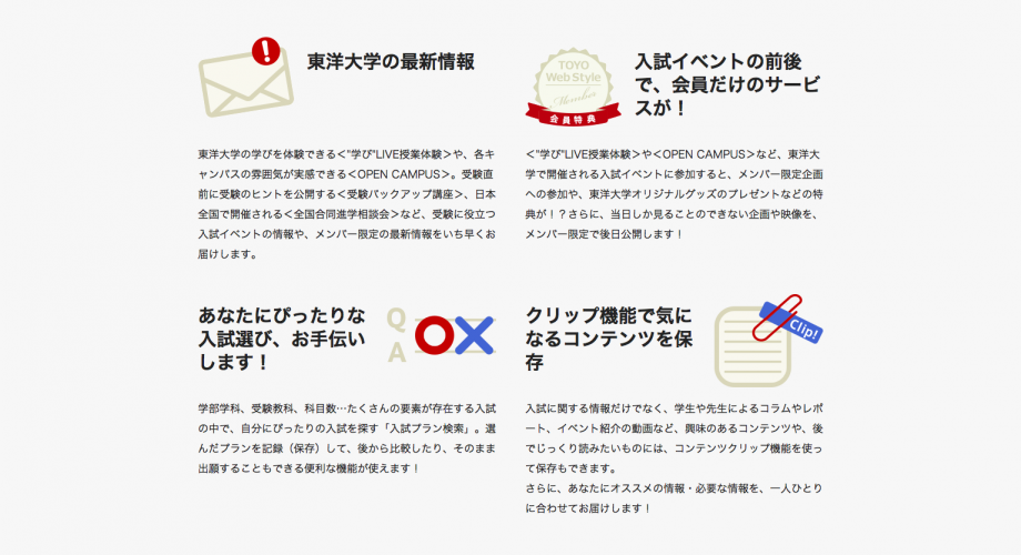 Web会員に向けたサービスでは最新情報の配信やパンフレットの閲覧だけでなく、自分に合った入試を探す「入試プラン検索」や「LIVE授業体験」など画期的な試みが多く執り行われています。